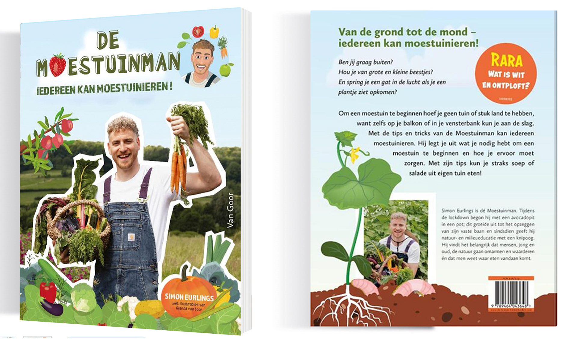 Coverontwerp, logo en binnenwerkillustraties: De moestuinman - iedereen kan moestuinieren - geschreven door Simon Eurlings - Van Goor kinderboeken