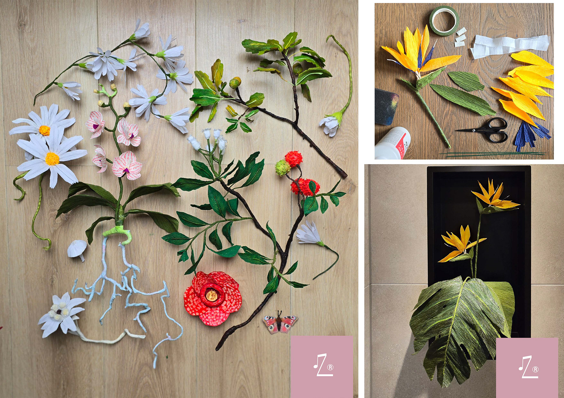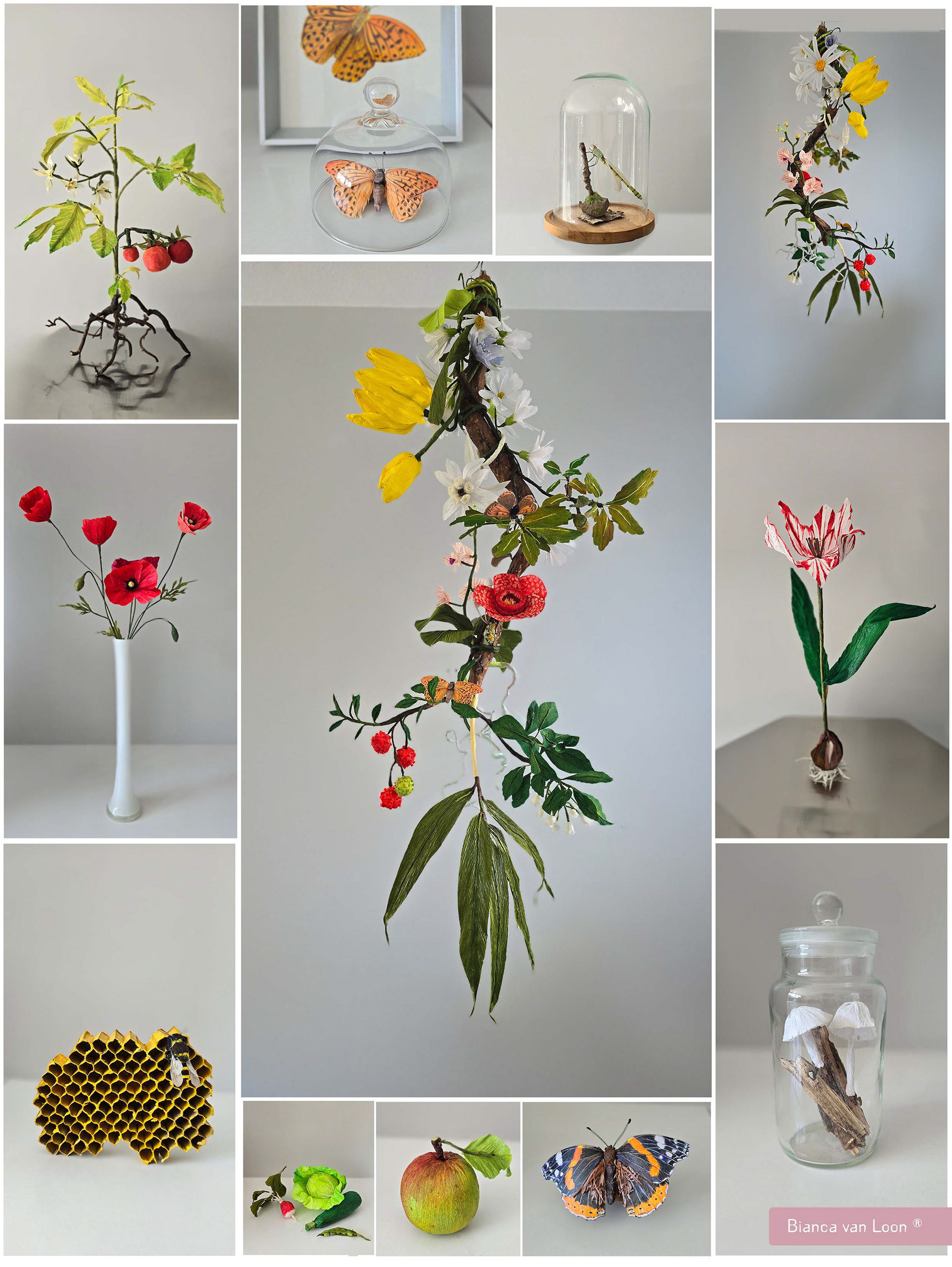 Ik maak papieren bloemen van (crepe) papier. Ook maak ik vlinders en andere insecten van papier met kleurpotlood.